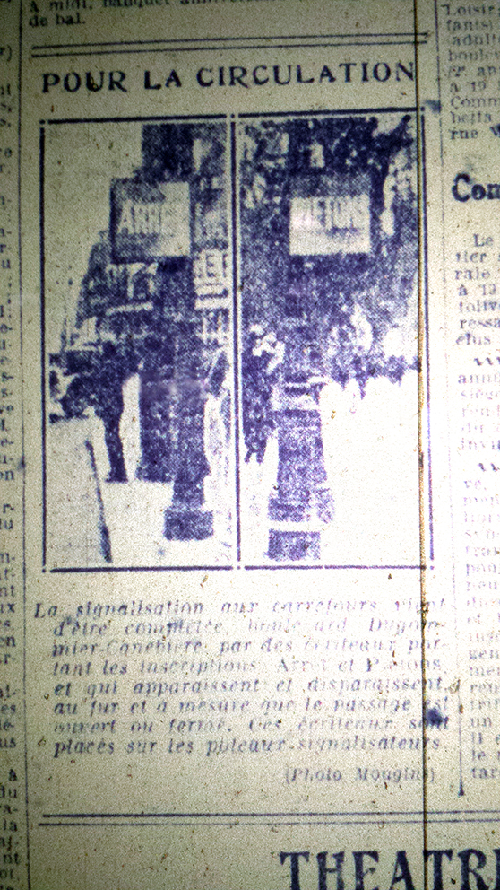 D'autres dispositifs sont installés la même année, toujours sur la Cannebière : "des écriteaux portant les inscriptions ARRET et PIÉTONS qui apparaissent et disparaissent au fur et à mesure que le passage est ouvert ou fermé" écrit Le Petit Marseillais.