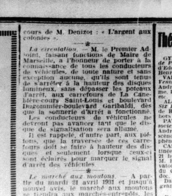Le 28 avril 1931, un adjoint au maire de Marseille informe ses habitants dans le journal Le Sémaphore que des nouveaux dispositifs composés de disques lumineux et d'une sonnerie entrent en service sur la Cannebière. Ce sont les premiers feux de signalisation installés à Marseille.
