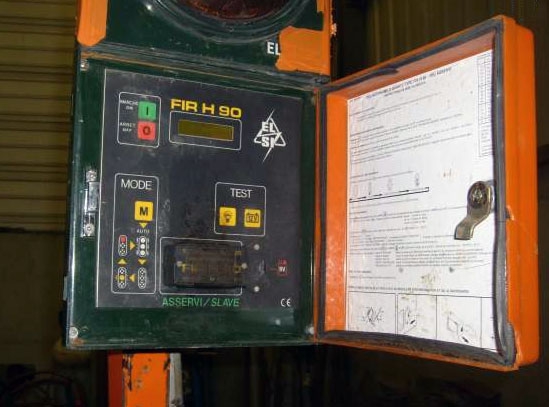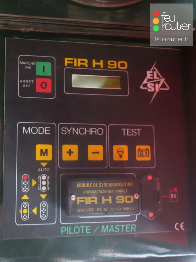 Feu de chantier FIRH 90 : commercialisé des années 1980 à début 2000. Signaux vert bouteille modèle Mondial du fabricant autrichien Futurit et électronique conçue par EL-SI. Armature en acier orange avec batterie.