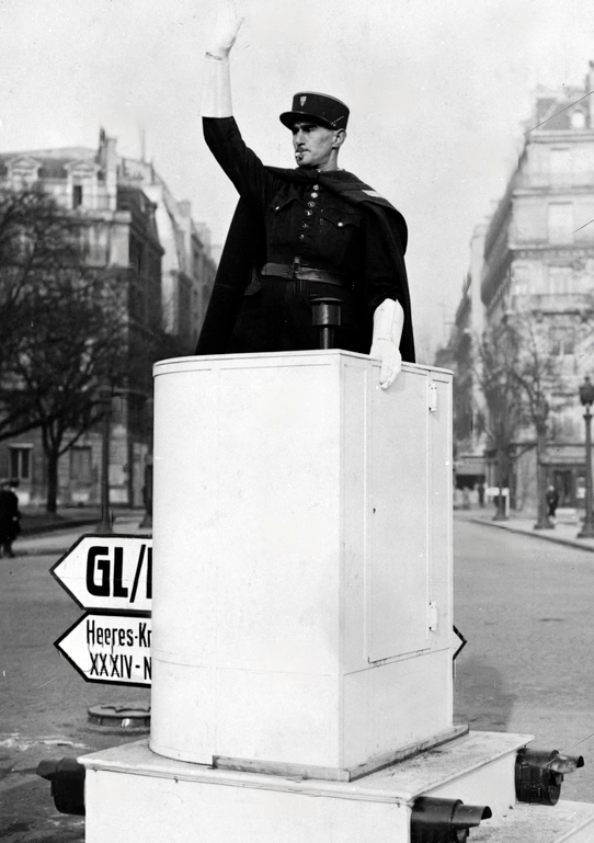 La majorité des feux de signalisation en place à Paris ont été plongés dans le noir par les allemands, par soucis de sécurité lors des couvre-feux. Leur emploi était de toute façon superflu face à la diminution du trafic automobile, et notamment en 1941 lors de la pénurie d'essence. Les feux éteints sont pour la plupart restés en place. En l'absence d'éclairage public, de nombreux mâts ont été peints avec des rayures blanches afin de les rendre plus visibles. Les allemands ont également retiré toutes les bornes de refuge.