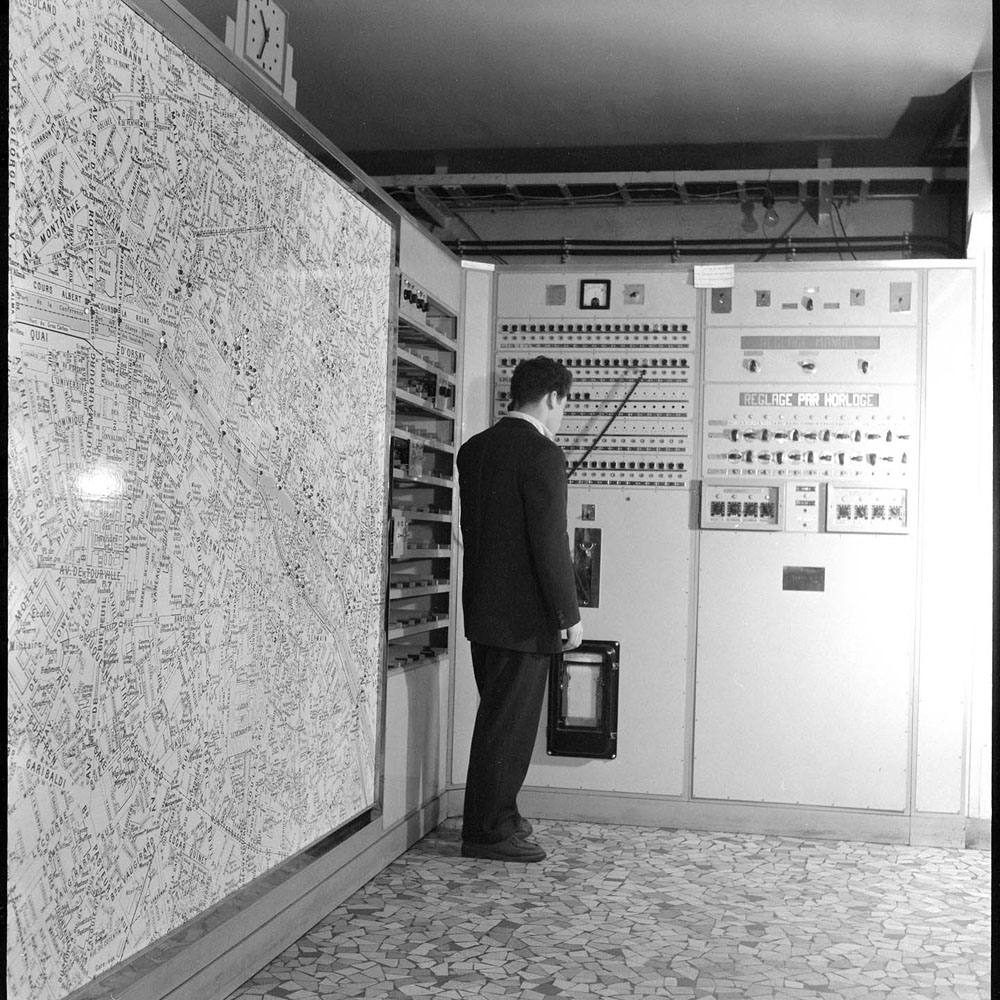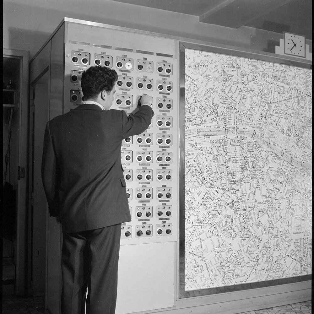 C'est en 1952 qu'est installé le Poste Cité, le premier poste central de régulation du trafic de Paris, dans le sous-sol du quartier général de la préfecture de police, sur l'île de la Cité. Il regroupait 100 carrefours de l'hyper-centre de Paris à sa mise en service, dont les plans de feux variaient manuellement ou automatiquement soit par des pédales de comptage du trafic, soit par horaire.