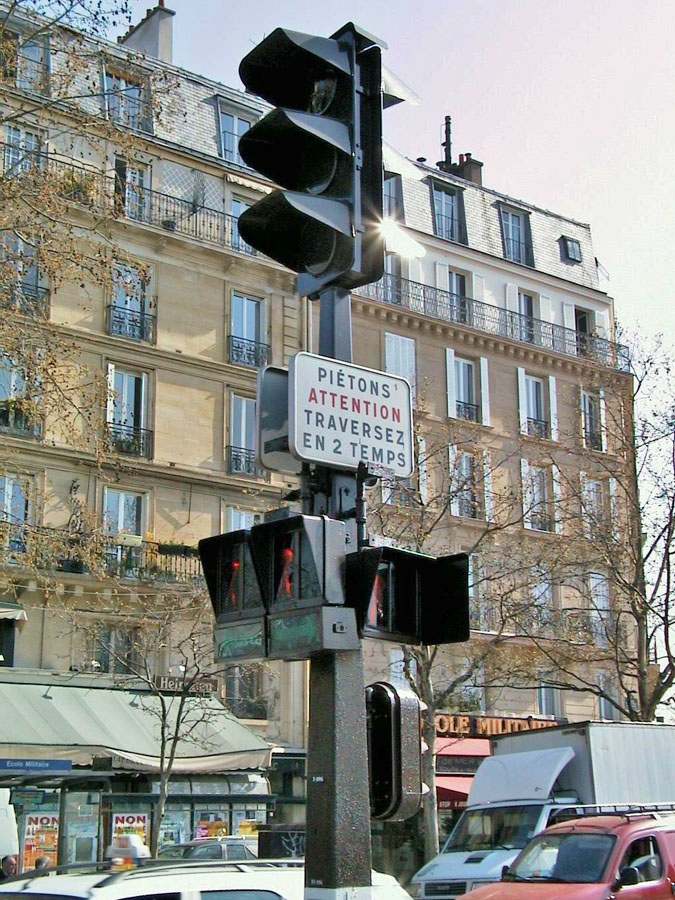 Dans les années 1970, les traversées piétonnes des grands boulevards étaient équipées d'un refuge au niveau du terre plein central, lui-même équipé d'un potelet avec des signaux piétons. La réglementation n'imposant pas encore un signal à chaque extrêmité du passage, seul le refuge central était pourvu de signaux piétons. Dans le cas où les phases piétons étaient différentes d'un côté et de l'autre, un signal additionnel rectangulaire composé d'une flèche sur fond vert était alors placé sous chaque signaux piétons côte à côte et s'allumait lors de la phase verte afin d'indiquer de quel côté les piétons pouvaient traverser. Les signaux lumineux étaient complétés par un panneau portant la mention "piétons attention traversez en deux temps". On doit ces signaux à Guy Maillet, l'ingénieur SLT d'EDF chargé des Vème et XIIIème arrondissements de Paris.