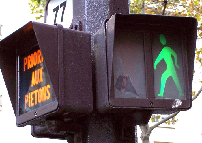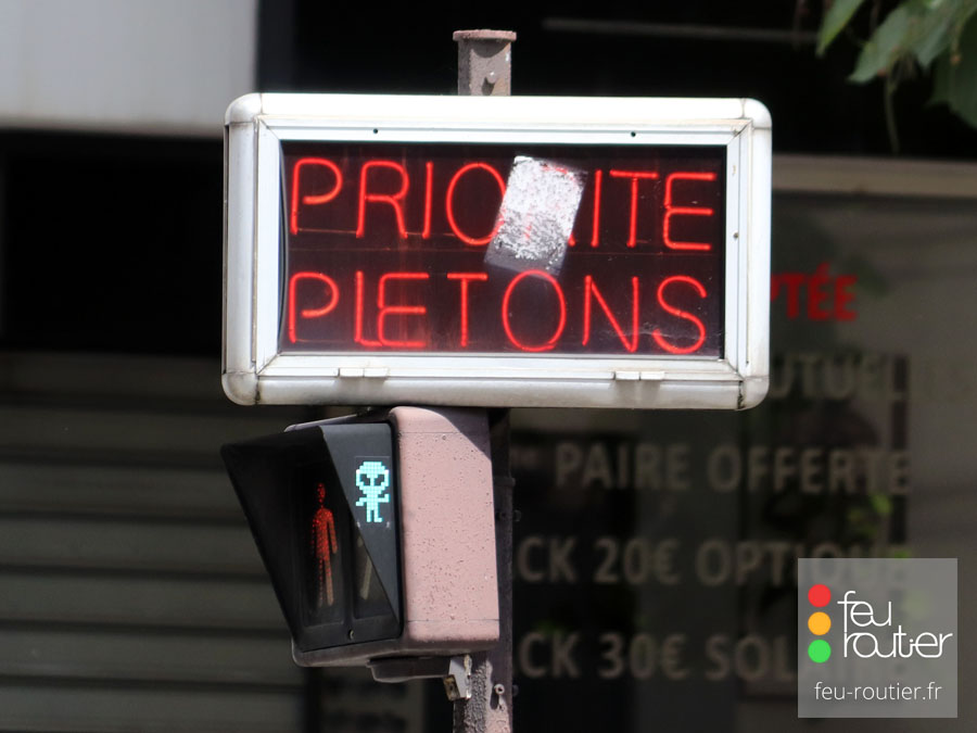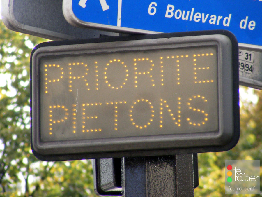 Dans les années 1980, un nouveau signal va faire son apparition : le priorité piétons. Il s'agit d'un panneau clignotant portant l'inscirption "PRIORITÉ PIÉTONS" chargé de rappeler aux automolistes le caractère prioritaire des piétons engagés sur un passage protégé, le plus souvent en tourne-à-gauche. Ce signal sera tout d'abord réalisé en tubes fluorescents (modèle Soredime), sur le même principe que les enseignes, puis à lampes incandescentes (modèle Théry Hindrick), puis à LED (modèle Star).