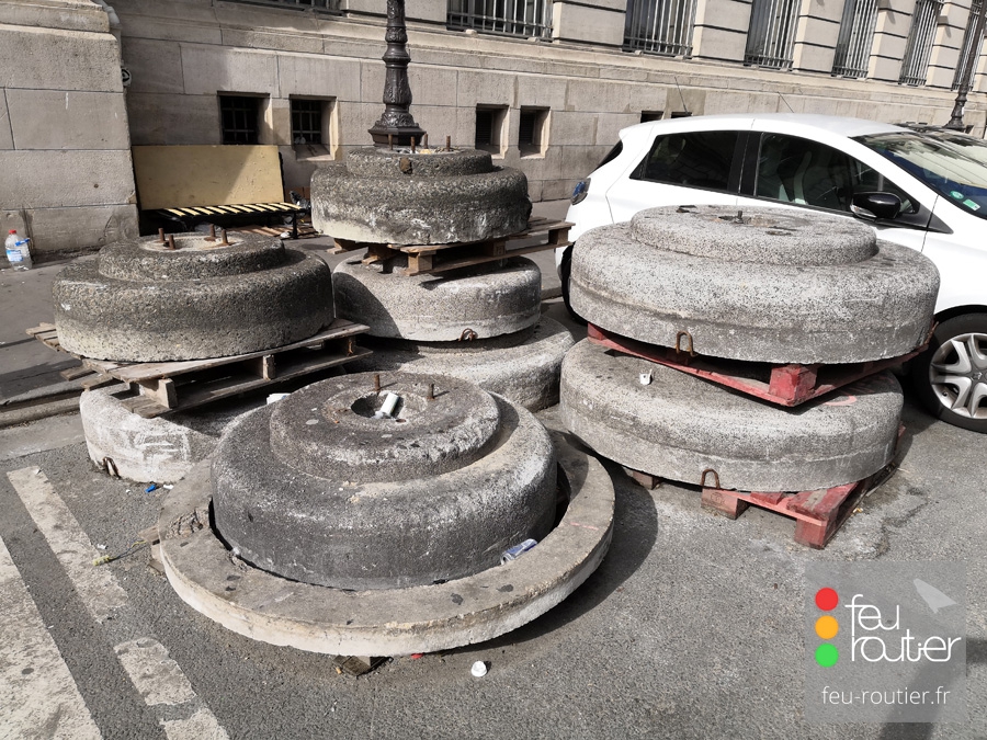 Ces socles sont donc progressivement déposés des refuges piétons au gré des réaménagements des carrefours parisiens, mais demeurent cependant toujours utilisés pour les feux sur potelet Mazas implantés en milieu de chaussée en l'absence de refuge piétons.