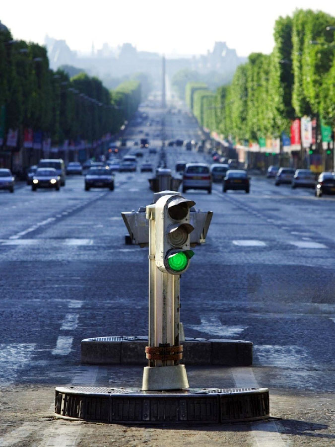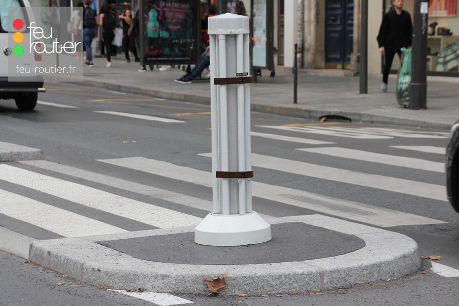 Depuis les années 1970, les bornes lumineuses des refuges sont équipées d'un feu parisien placé à faible hauteur, pour respecter l'esthétique de l'avenue et ne pas gâcher la vue sur l'arc de triomphe. Le problème est que la réglementation française impose une hauteur minimale de 2 mètres pour l'implantation des signaux tricolores. La ville de Paris va donc céder en 2011 et remplacer les bornes des refuges des Champs-Elysées par des feux sur potelet Mazas. Ces feux restent cependant toujours fixés sur des musoirs amovibles qui sont retirés tous les ans à l'occasion du défilé militaire du 14 juillet.