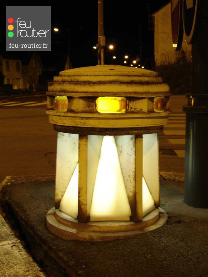 Equipement de signalisation lumineuse placé au nez des ilots séparateurs en milieu de chaussée et clignotant afin de signaler l'obstacle aux automobilistes.