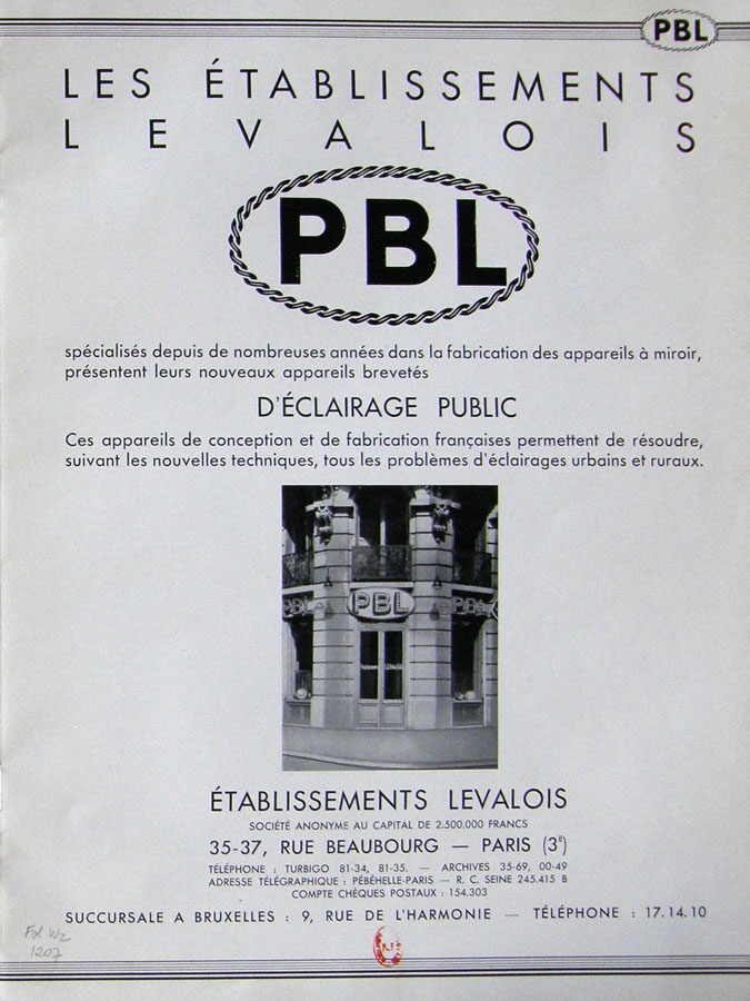Au début des années 1930, PBL noue un partenariat avec le fabricant d'éclairage public Holophane S.A. À la même période, la ville de Paris commence à équiper les carrefours des grands boulevards de feux de signalisation afin de réguler la circulation routière de la capitale. PBL conçoit alors plusieurs modèles de signaux lumineux électriques servant à la signalisation de sens interdits ou à proximité d'école, ainsi que des bornes lumineuses.