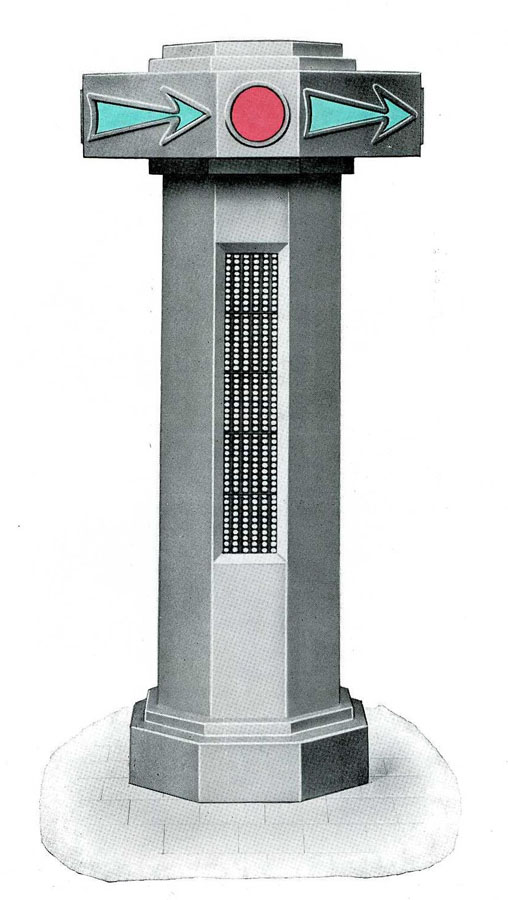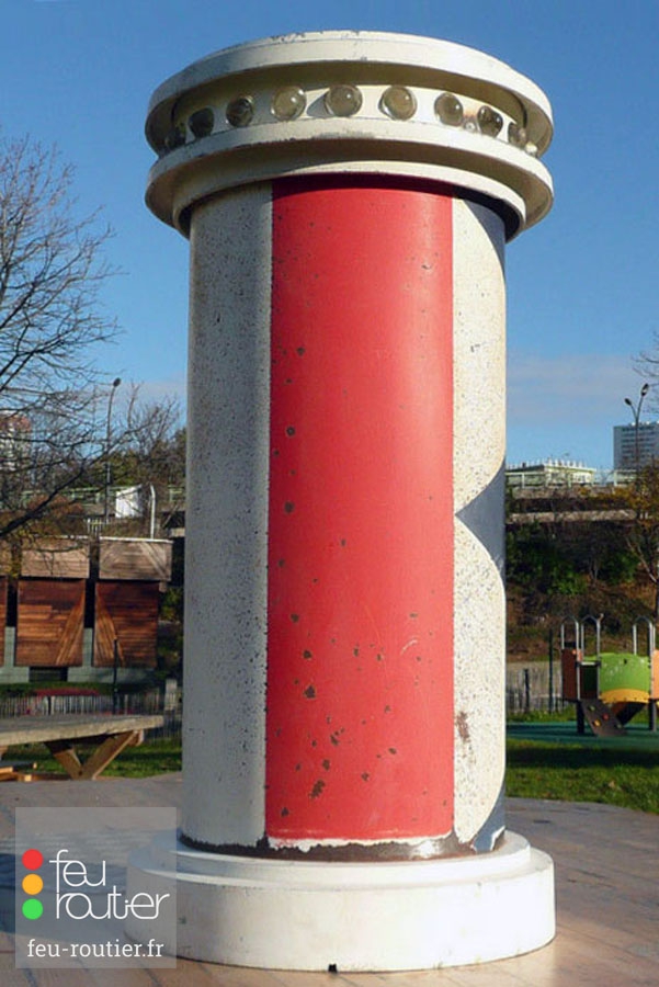 Cette borne lumineuse haute est composée de réflecteurs à billes de verre sur la partie supérieure, et d'un fût rétro-éclairé avec un décor composé d'une bande rouge et de deux grandes flèches. Elle a été commercialisée à partir de 1959.