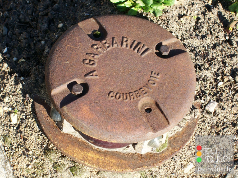 Cette borne lumineuse basse est composée de lampes incandescentes clignotantes et de plusieurs lentilles rouges. Elle est surnomée "yeux de chat" en raison de la forme allongée de la lumière qu'elle produit la nuit, et était très utilisée dans les années 1960 et 1970 pour la signalisation des ilots urbains.
