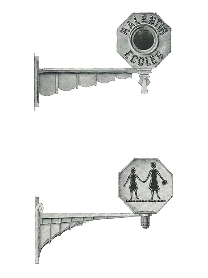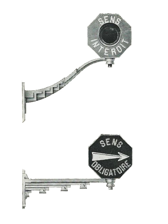 Signal de forme octogonale réalisé en aluminium avec lentille centrale en verre Holophane, commercialisé à partir de 1932. Feu fixe ou clignotant, seul ou avec texte et symbole tels que sens interdit, sens obligatoire, école, passage clouté.