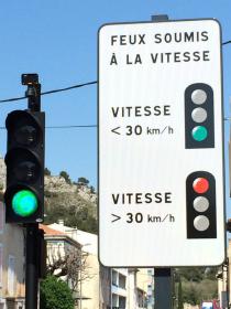 À l'inverse du dispositif précédent de feux asservis à la vitesse, ce système récompense l'automobiliste qui respecte la limitation de vitesse.