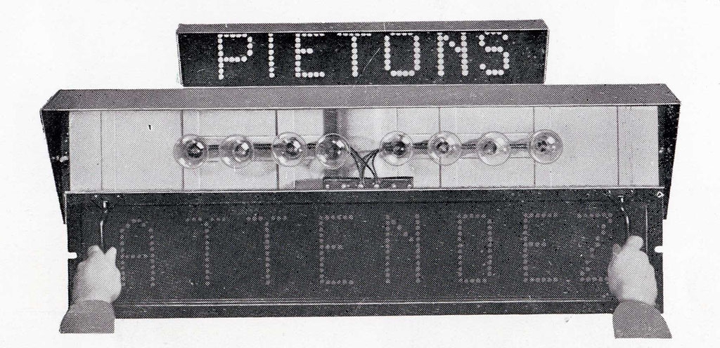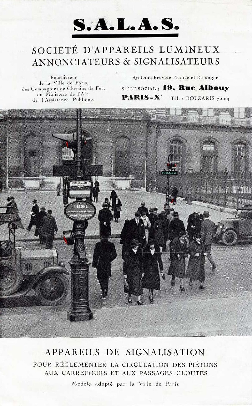 En 1934, plusieurs brevets ont été déposés pour l'invention d'appareils de signalisation routière. Il s'agit de signaux pour piétons, dont les inscription "ATTENDEZ" en rouge, et "PASSEZ" en vert, s'allument alternativement et en synchronisation avec les feux rouges à destination des voitures. Plusieurs carrefours parisiens ont été équipés de ces signaux pour piétons.