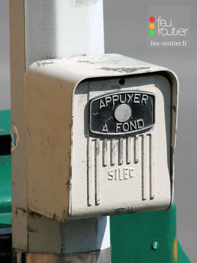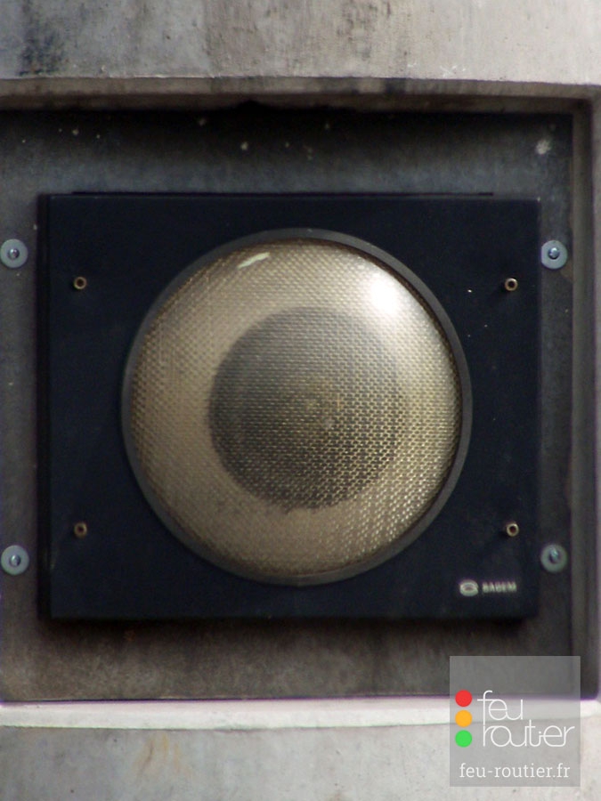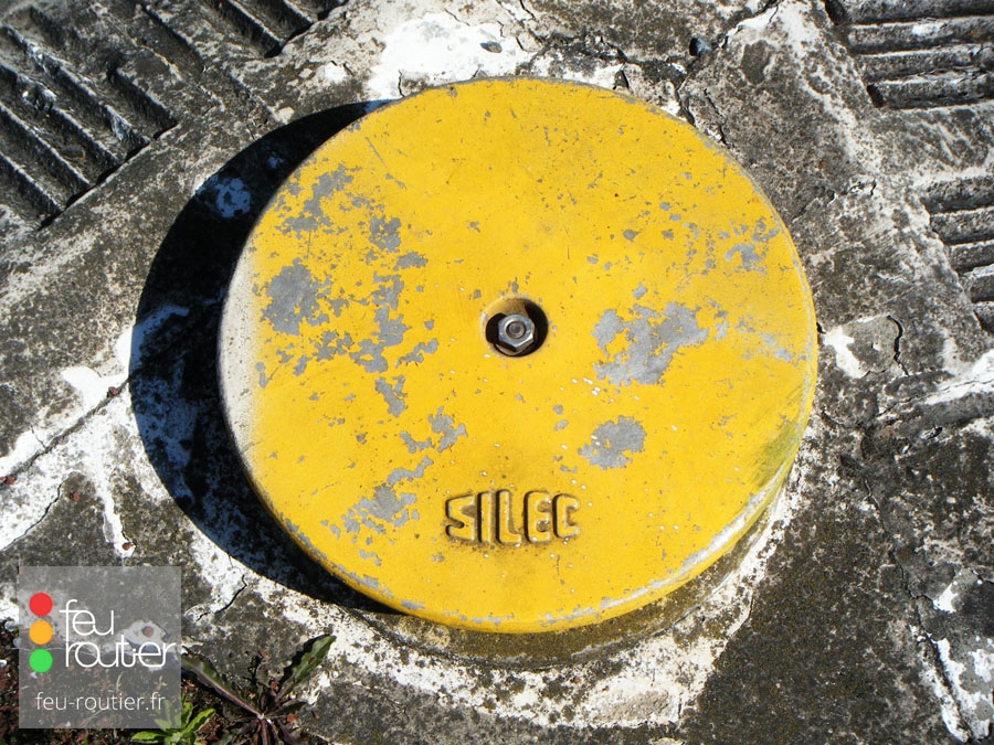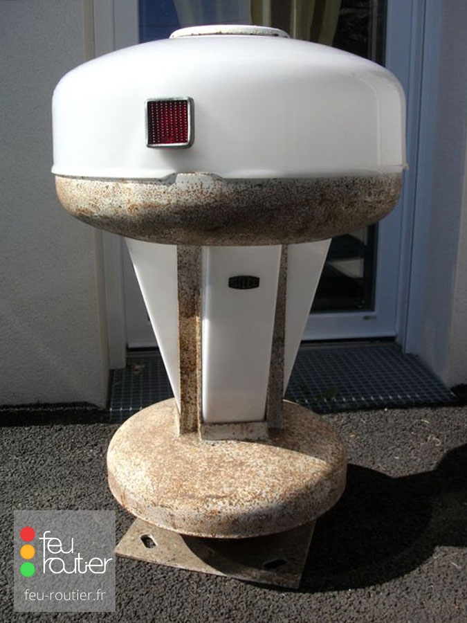 Borne lumineuse placée au ras du sol pour la signalisation des nez d'ilôt et des obstacles. Réalisée en fonte, peinte de couleur jaune avec des sources lumineuses à lampes incandescentes clignotantes. Plusieurs modèles de différentes dimensions ont existé.