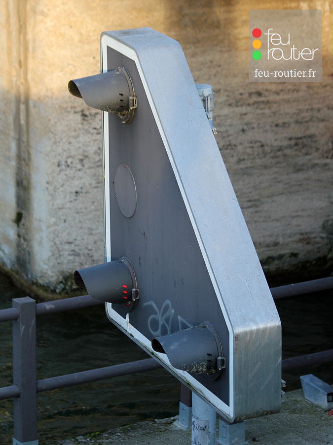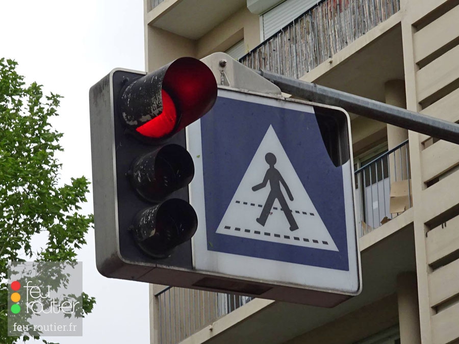 Ce signal piétons comprend un pictogramme rouge et un pictogramme vert séparés par plusieurs rectangles jaunes. La séparation en plusieurs rectangles laisse penser qu'il s'agissait à l'origine d'un sablier, les rectangles s'éteignaient les uns après les autres en fonction du temps qu'il restait aux piétons pour traverser. Aujourd'hui, tous les rectangles jaunes s'allument simultanément en clignotant pour prévenir le piéton qu'il a été pris en compte par le détecteur PPS.