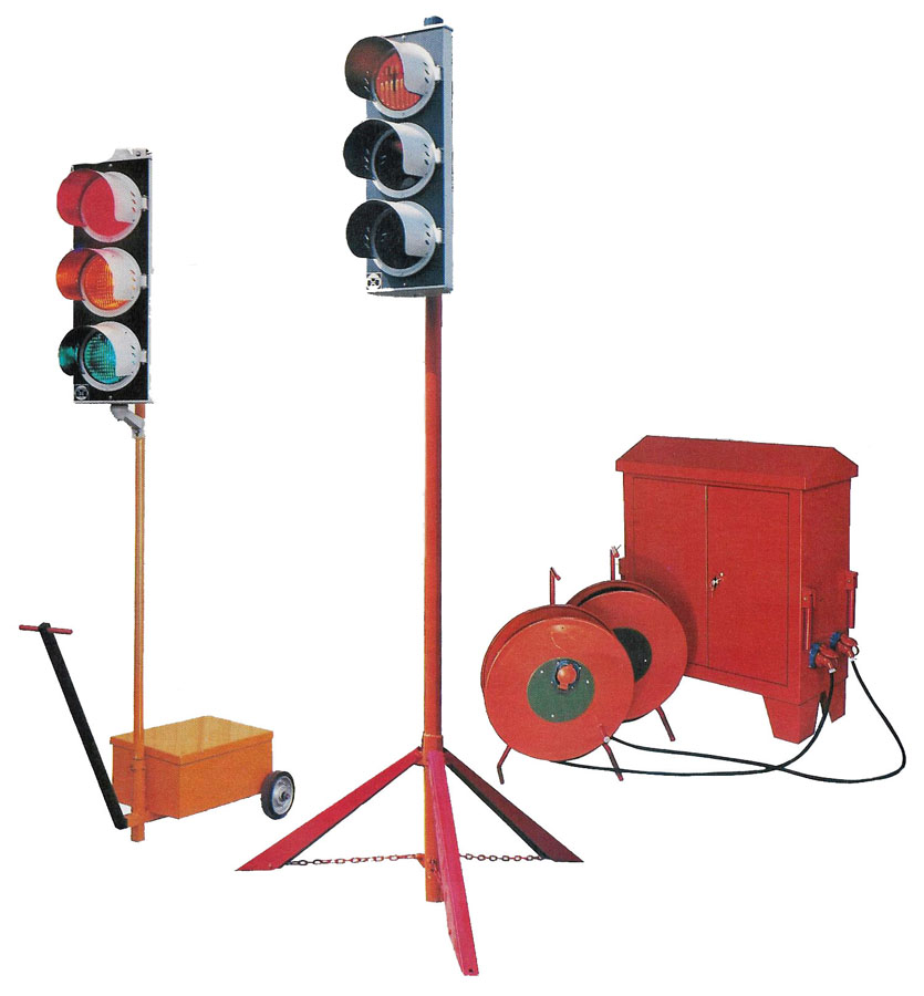 - régulation mobile : signal tricolore monté sur mât mobile à pied repliable et reliés par câble à une armoire de commande pour alternat ou régulation avec temps de dégagement.