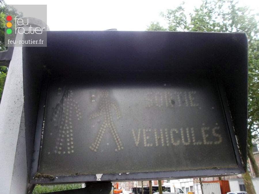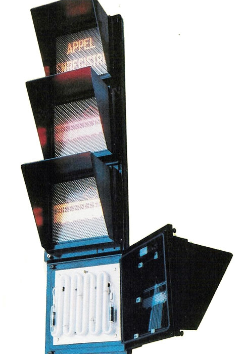 Application spéciale pour le tramway de la communauté urbaine de Lille : signal composé d'un ensemble de 4 caissons polycarbonate type Futurit Standard à tubes fluorescents. Premier caisson mention "appel enregistré", et caissons rouge, jaune, vert avec pictogramme tramway. Ces feux ont été remplacés par les feux tram R17 lorsqu'ils ont été normalisés.