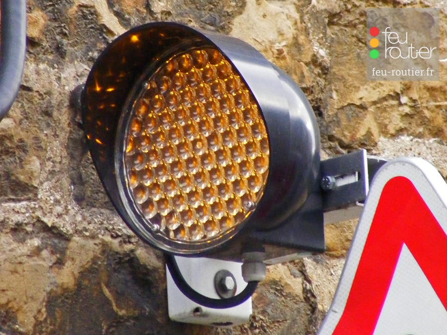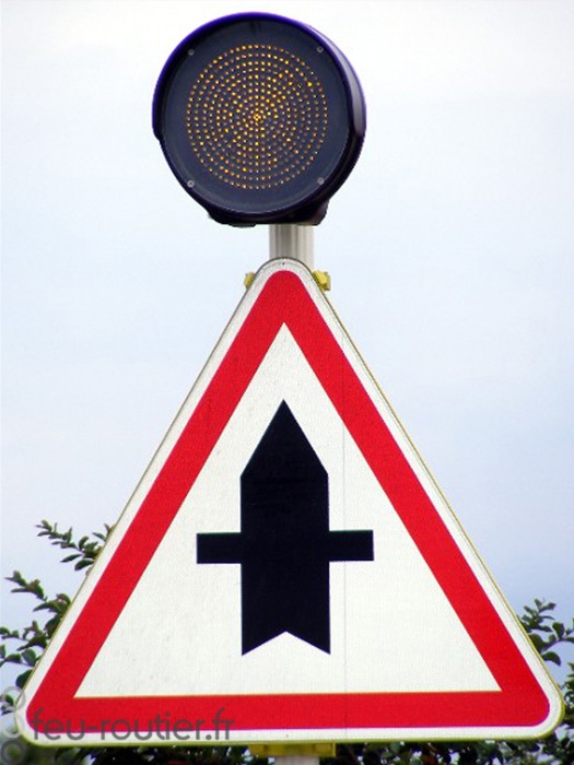 On le rencontre le plus souvent en milieu urbain pour le renforcement de la signalisation permanente verticale, en alimentaion 12V ou 220V, sur alimentation solaire.