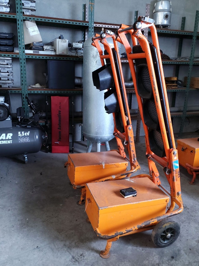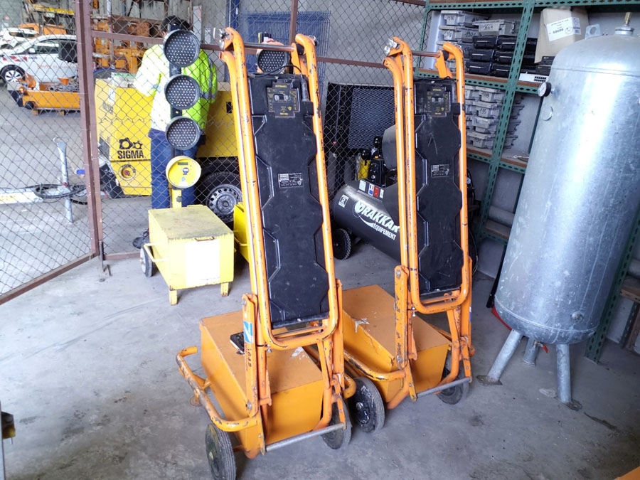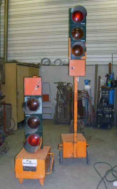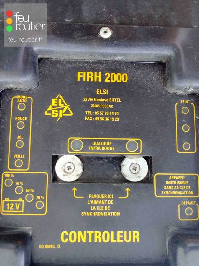 Feu de chantier FIRH 90 : commercialisé des années 1980 à début 2000. Signaux vert bouteille modèle Mondial du fabricant autrichien Futurit et électronique conçue par EL-SI. Armature en acier orange avec batterie.