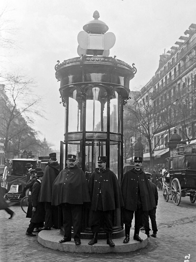 Le 10 avril 1912, un exemplaire du kiosque-signal Goupil conçu par les services d'architecture et des travaux de la ville de Paris est installé à titre expérimental au carrefour situé à l'angle des rues Montmartre et du Faubourg-Montmartre. Ce lieu, surnommé le carrefour des écrasés, a été choisi car il était à cette époque le plus gros point noir de la circulation parisienne. Le kiosque est différent du projet initial, l'écriteau sommital a été remplacé par un cube rétro-éclairé par une ampoule à incandescence avec des faces blanches pour le passage libre et des faces rouges pour l'arrêt. Le changement d'état avait lieu toutes les trois minutes, annoncé par une sonnerie.