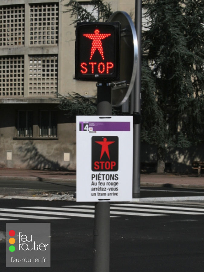 Ce signal piétons est utilisé pour interdire le passage aux piétons. Il n'est utilisé que sur les traversées piétonnes situées sur une emprise d'un service régulier de transport en commun sur site propre comme un tramway ou un bus à haut niveau de service. Il a tout d'abord été expérimenté en 2003 sur la ligne A du tramway de Bordeaux, puis officiellement introduit dans la réglementation française par l'arrêté du 10 avril 2009.