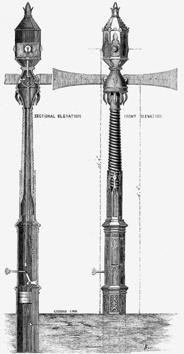 L'invention se compose de deux bras pivotants sur eux mêmes, ainsi que d'un sémaphore alimenté par une flamme au gaz à son sommet pour renforcer la visibilité de l'ensemble la nuit. Un agent de police placé au pied du mât tourne une manivelle pour actionner le mécanisme permettant de faire pivoter les bras.