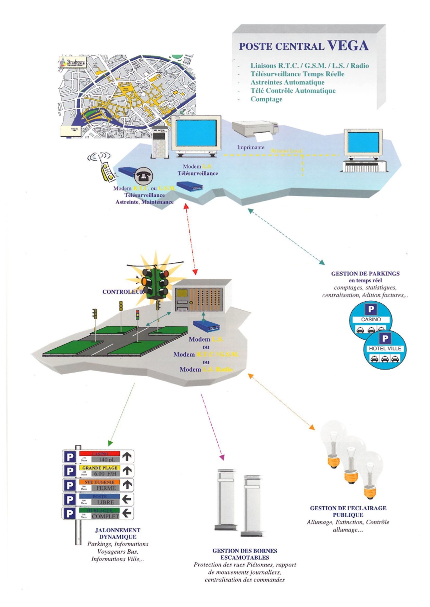 Le poste central VEGA est un logiciel de surveillance et de gestion des contrôleurs des années 1990 : télésurveillance en temps réel, astreintes automatiques, télé contrôle automatique, comptage, liaisons RTC – GSM –LS – RADIO.