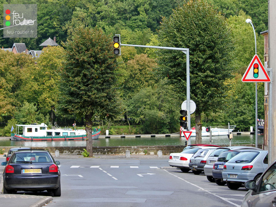 État spécifique d'un carrefour au jaune clignotant., où le cycle tricolore n'est pas actif.