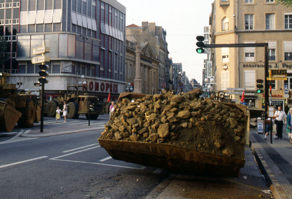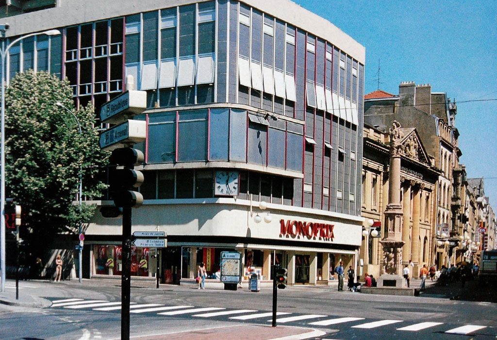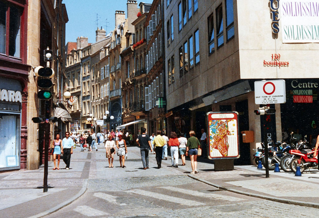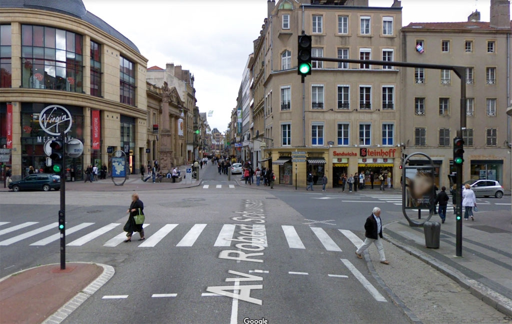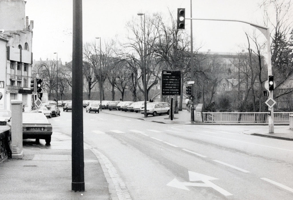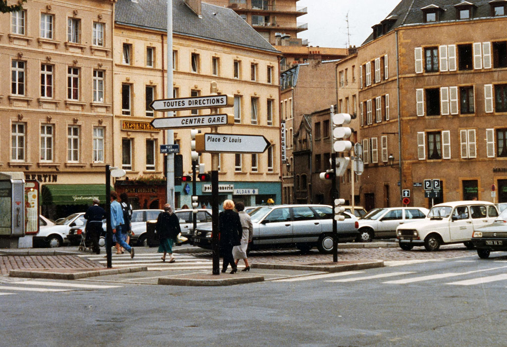 Ce carrefour central de la ville de Metz a été le premier a être équipé de signaux lumineux de circulation dans les années 1950. Il s'agissait d'un mât à base lumineuse placé au centre du carrefour avec 4 feux EVR. De plus petits feux de type répétiteurs Ville de Paris, étaient placés plus en aval du carrefour en tant que signaux pour piétons. Cette configuration a été conservée jusque dans les années 1970, où ce carrefour a été réaménagé dans une configuration plus classique, mais toujours avec des feux EVR Classique Aluminium.