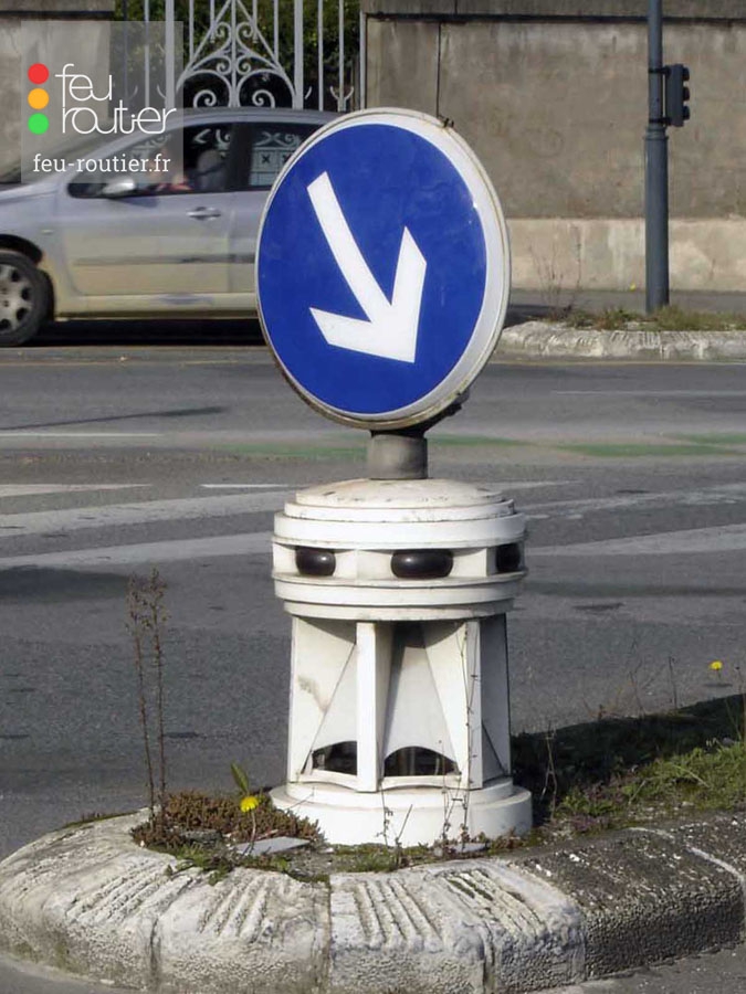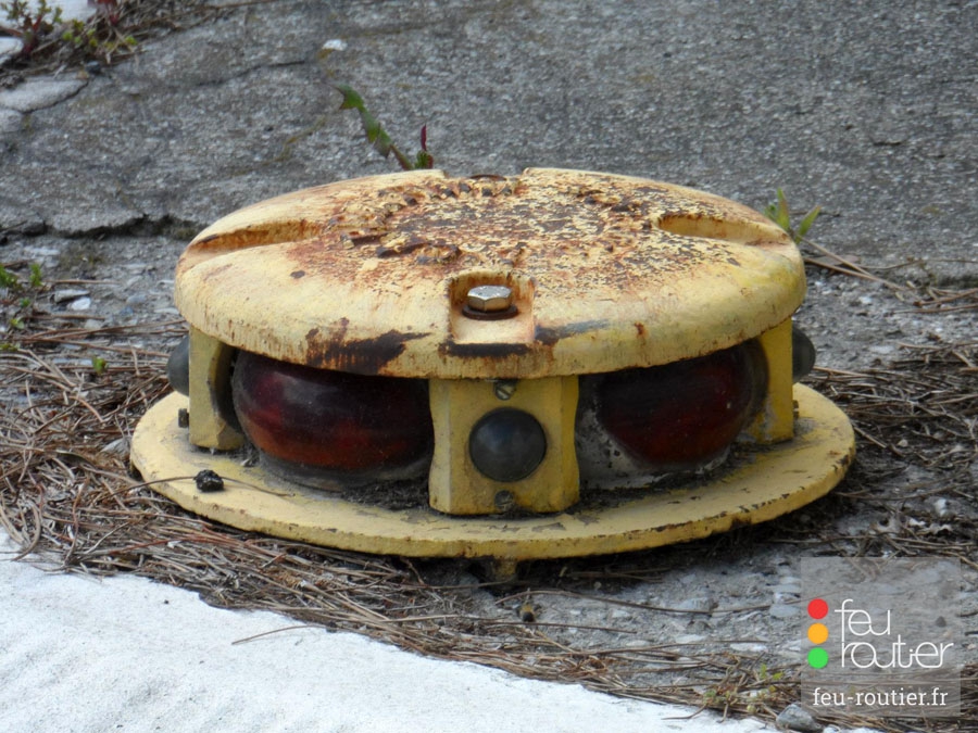 Cette borne lumineuse basse est composée de lampes incandescentes clignotantes et de plusieurs lentilles rouges. Elle est surnomée "yeux de chat" en raison de la forme allongée de la lumière qu'elle produit la nuit, et était très utilisée dans les années 1960 et 1970 pour la signalisation des ilots urbains.