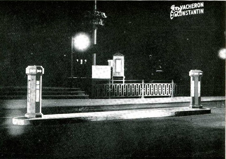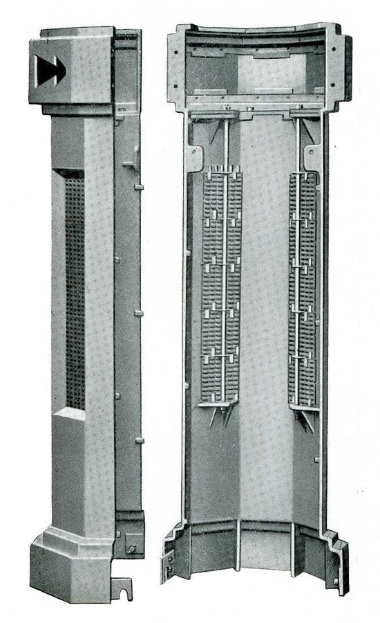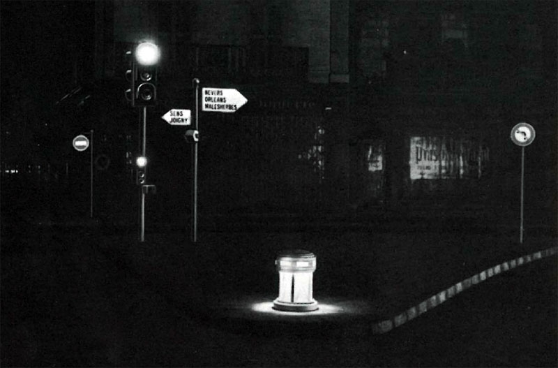 Cette borne lumineuse haute est composée de réflecteurs à billes de verre sur la partie supérieure, et d'un fût rétro-éclairé avec un décor composé d'une bande rouge et de deux grandes flèches. Elle a été commercialisée à partir de 1959.