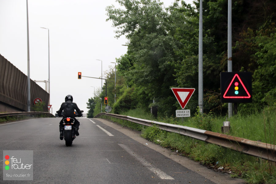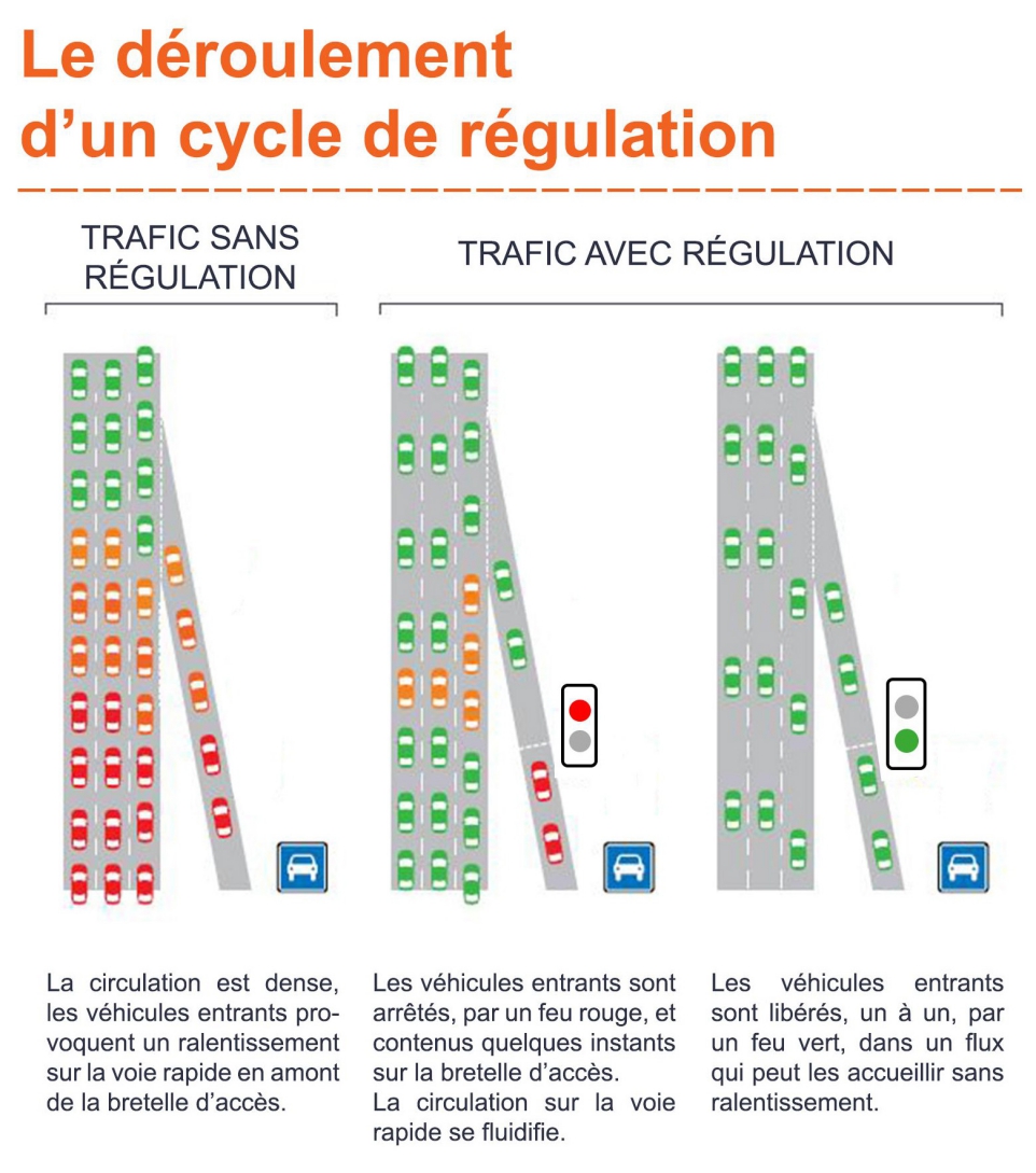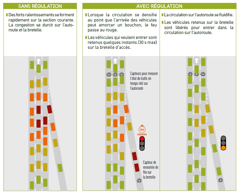 Si la voie d'accès à l'axe routier concerné est prioritaire, le feu R22v est employé (rouge-jaune-vert), dans le cas inverse le feu R22j (rouge-jaune-jaune clignotant) est employé. Les feux tricolores doivent être implantés sufisament loin de la voie d'insertion pour permettre l'accélération des véhicules. Lorsque la régulation est active, le temps d'arrêt des véhicules doit être limité afin d'éviter la formation d'une file d'attente remontant en amont de la bretelle. Lorsque la régulation est inactive, les feux sont totalement éteints (position neutre).