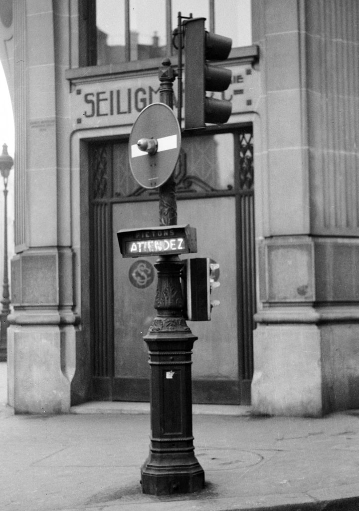 En 1934, plusieurs brevets ont été déposés pour l'invention d'appareils de signalisation routière. Il s'agit de signaux pour piétons, dont les inscription "ATTENDEZ" en rouge, et "PASSEZ" en vert, s'allument alternativement et en synchronisation avec les feux rouges à destination des voitures. Plusieurs carrefours parisiens ont été équipés de ces signaux pour piétons.