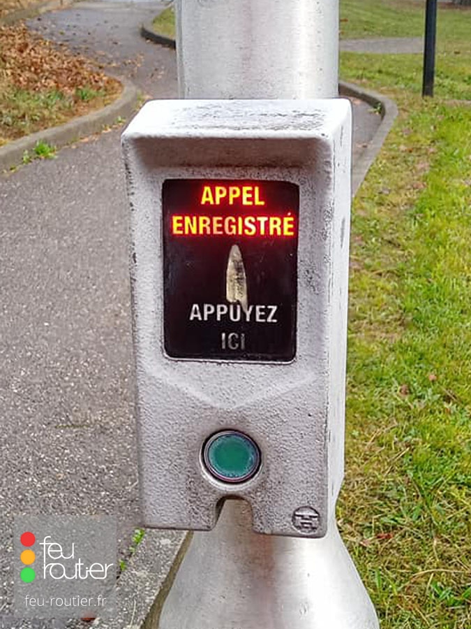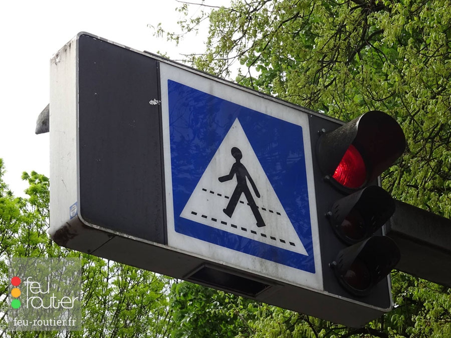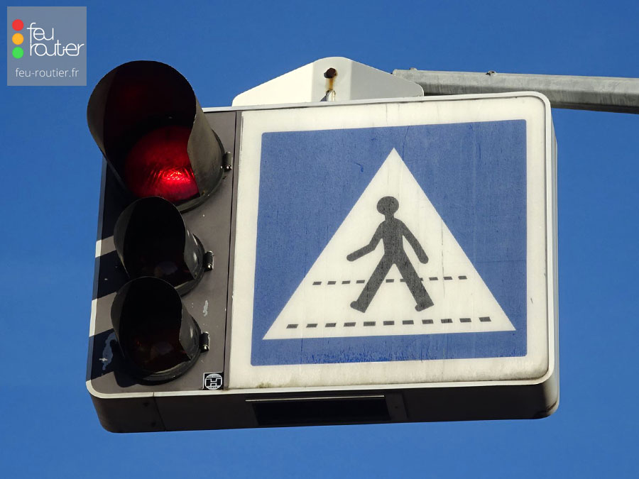 Ce signal piétons comprend un pictogramme rouge et un pictogramme vert séparés par plusieurs rectangles jaunes. La séparation en plusieurs rectangles laisse penser qu'il s'agissait à l'origine d'un sablier, les rectangles s'éteignaient les uns après les autres en fonction du temps qu'il restait aux piétons pour traverser. Aujourd'hui, tous les rectangles jaunes s'allument simultanément en clignotant pour prévenir le piéton qu'il a été pris en compte par le détecteur PPS.