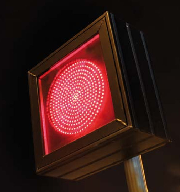 On le rencontre le plus souvent en milieu urbain pour le renforcement de la signalisation permanente verticale, en alimentaion 12V ou 220V, sur alimentation solaire.